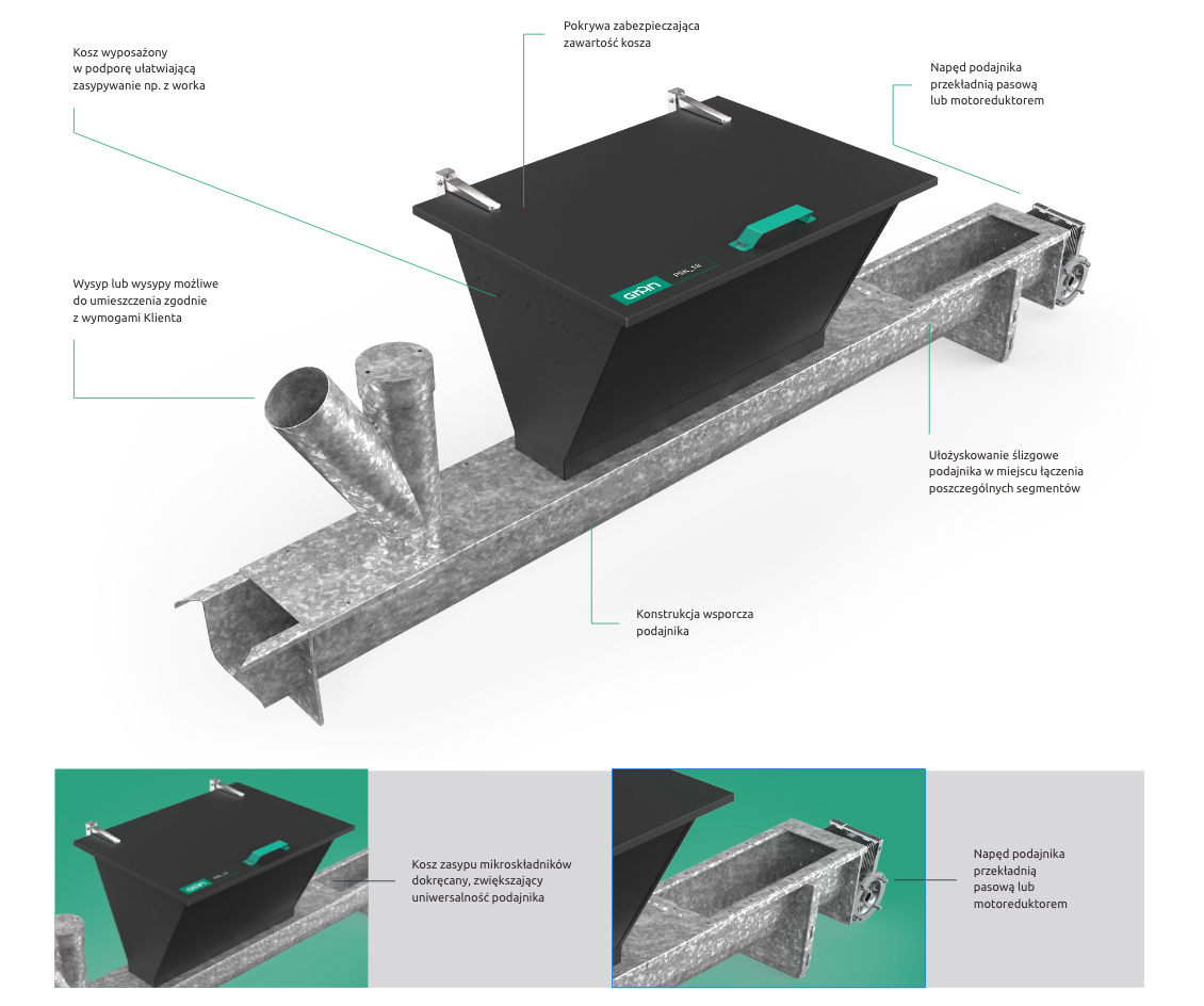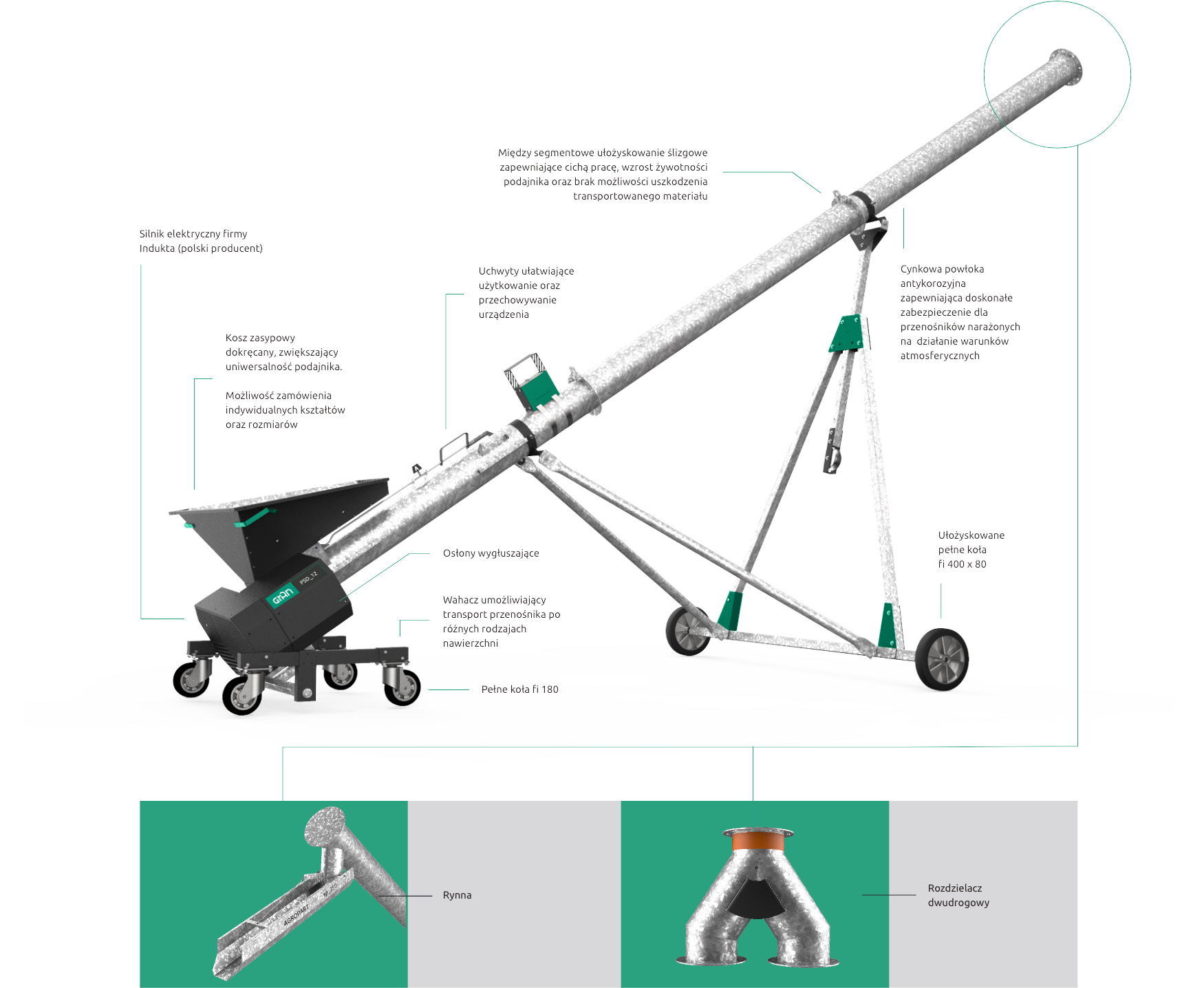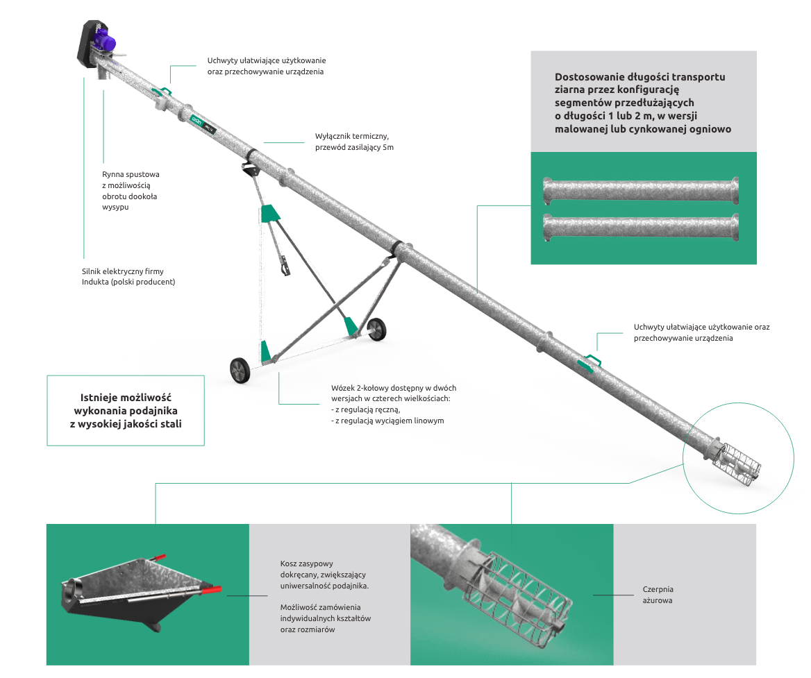 przenośnik o modułowej konstrukcji przewodu transportującego, z silnikiem napędu umieszczonym na górze przy rynnie spustowej, z ażurową czerpnią w koszu zasypowym lub wprost w pryzmie zboża, na mobilnej konstrukcji nośnej – wózek z kółkami, całość wykonana z blachy ocynkowanej